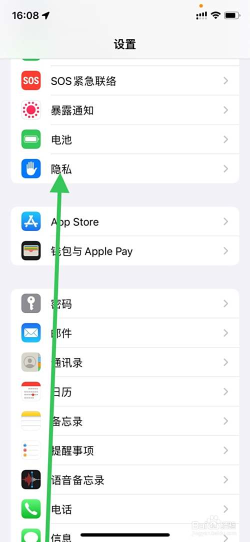 手机“设置”显示页面下滑点击“隐私”。