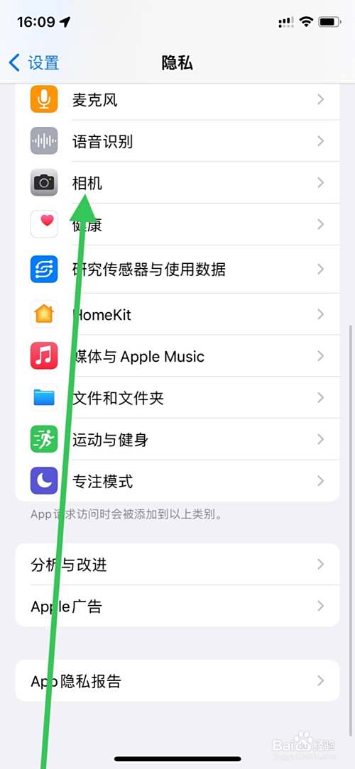 隐私显示页面下滑点击“相机”。