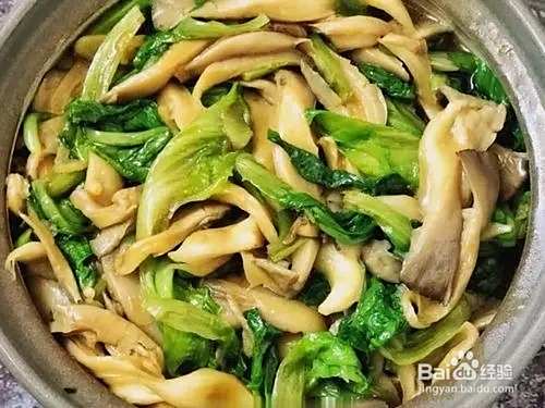 锅内倒入少许油,放入葱花炒香,放入平菇翻炒2分钟后放入生菜翻炒1分钟。