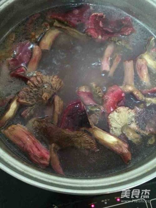 最后放入洗净后的红菇煮上半小时,调入适量盐即可