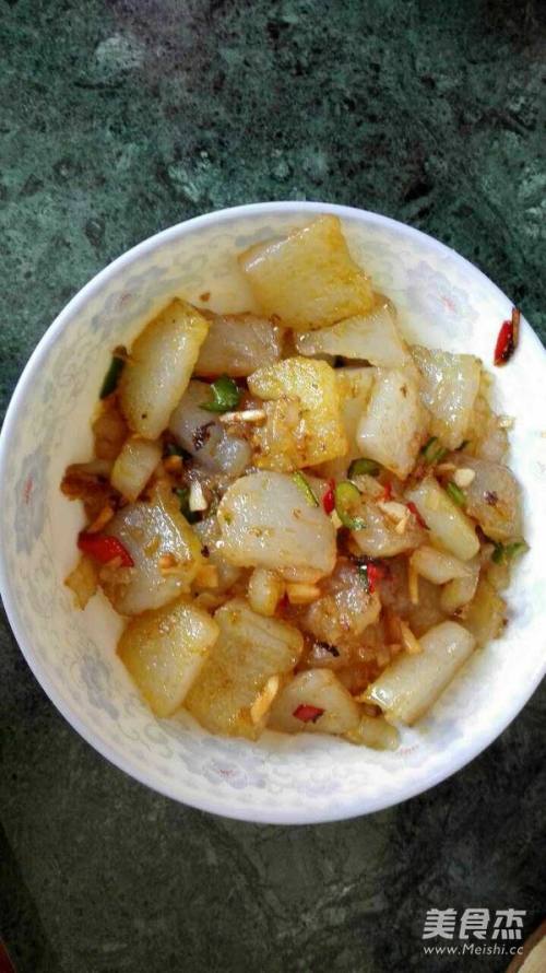 油锅加热,放葱姜蒜椒,盐,味精等调好味后把煎好的凉粉放进翻炒,装盘
