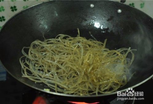 将红薯粉条放入油锅里,快速翻炒几下,让红薯粉条稍微受热变软