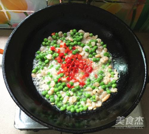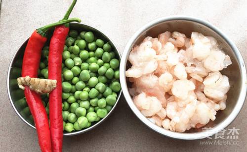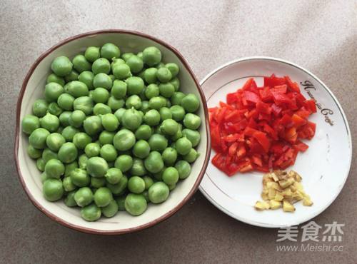3碗豆洗净,红椒去籽切碎末,生姜切碎末。