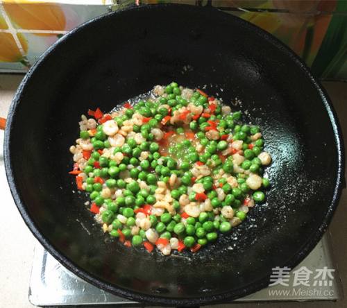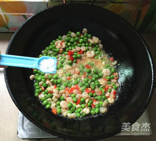 昂宝嚷着想吃虾,可我又不想出门,最好的办法就是找存货,翻冰箱翻冰箱,之前买的一包净虾仁,因为虾仁个头比较小,拿它做菜了几回,还剩一些就一直搁角落里了。呵呵,正好拿它来炒碗豆米,点缀一些红椒末,除了颜值不错外,又好吃又营养,很能挑起大小朋友的食欲哟……。