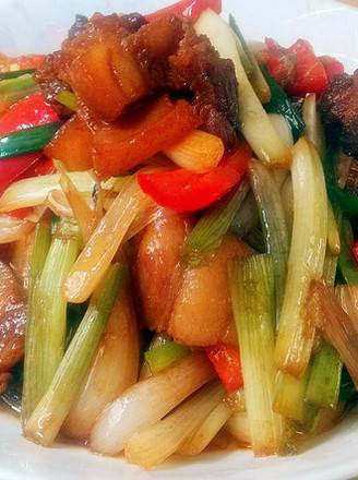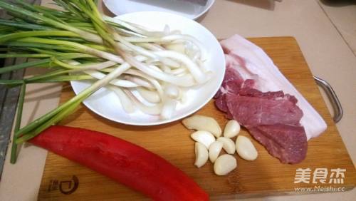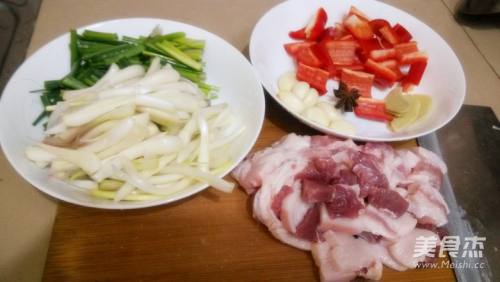 2红椒切四半再切段,荞菜切段,猪肉切片,蒜拍一下,姜切片。