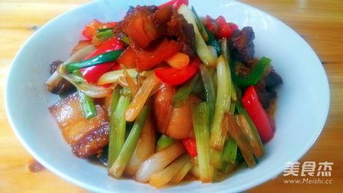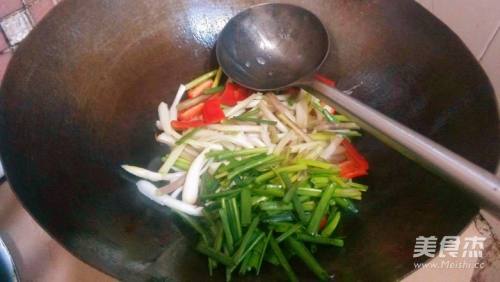 9倒入刚过滤出的猪油烧热倒入荞菜、红椒一起炒软