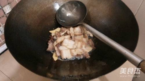 4倒一点点油煸炒猪肉不会粘锅,放猪肉、姜、八角一起煸香