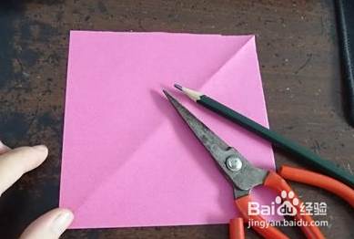 首先准备好一张正方形的彩纸,一把剪刀,一支笔。如下图。