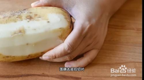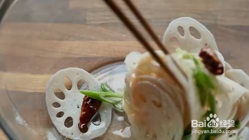 莲藕切片,煮一分钟后控水。控干后放入葱丝等调味品,浇上热油,淋上醋和白糖提鲜,搅拌后即可食用。