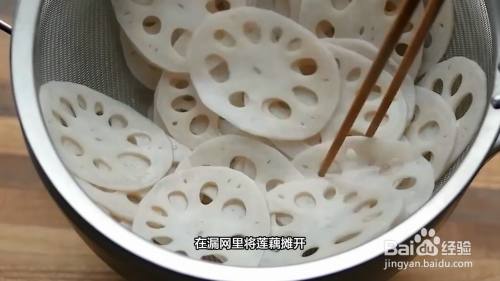 煮一分钟后,盛出来控水,在漏网里将莲藕摊开。