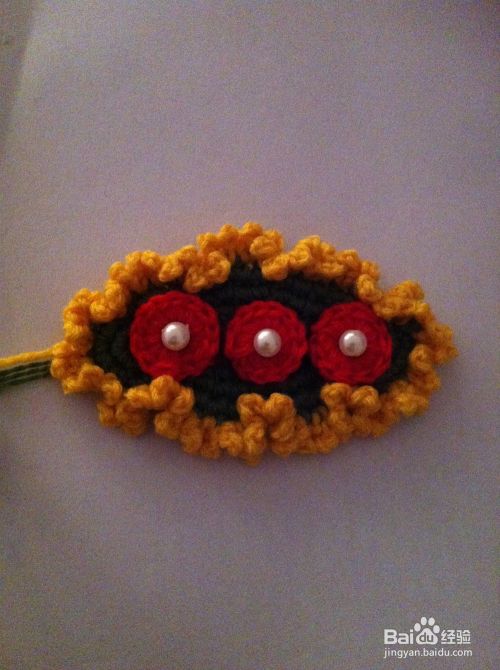 将钩织花朵摆放好后,粘贴好粘在发夹的上面,这样一朵漂亮的花朵胸花发饰就编织完成了。