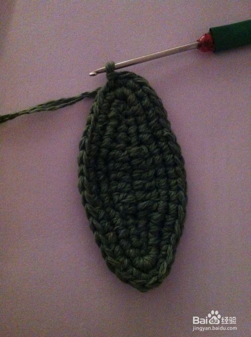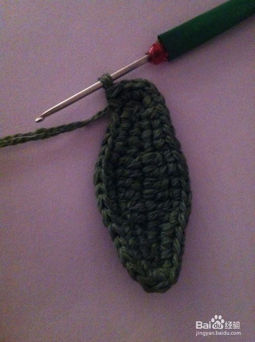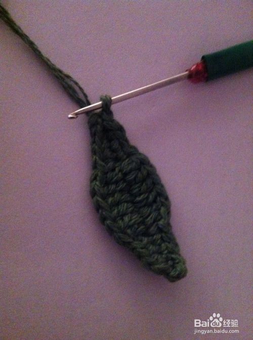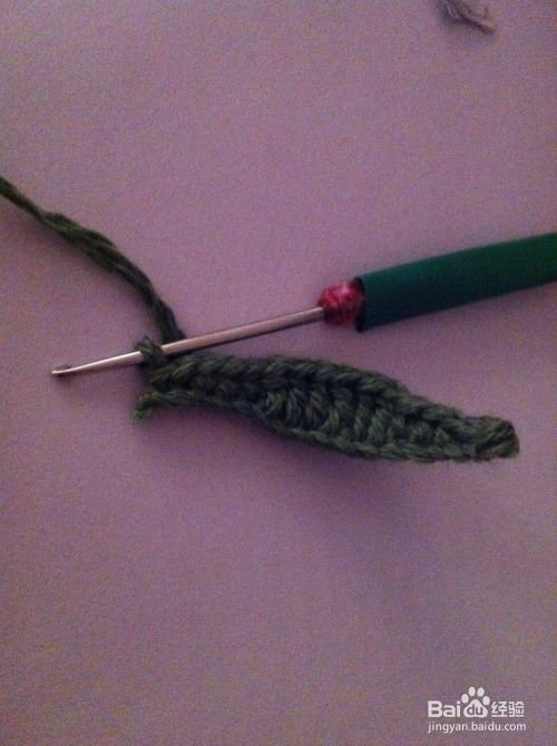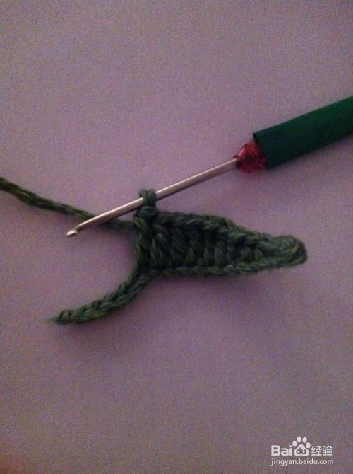 绿色线编织,首先用钩针编织 拉花17针,然后返回紧锁3针。
