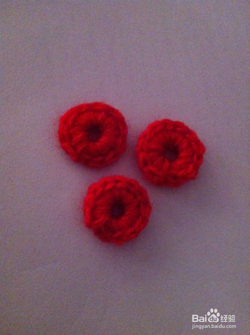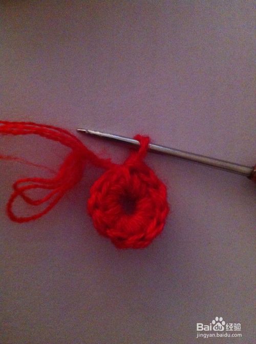 红色线编织,钩针方法,首先拉花6针,然后紧锁到第一针针孔里面,钩出一个小圈圈,然后在这个小圈圈里面锁针12针,完成一圈,收针断线。
