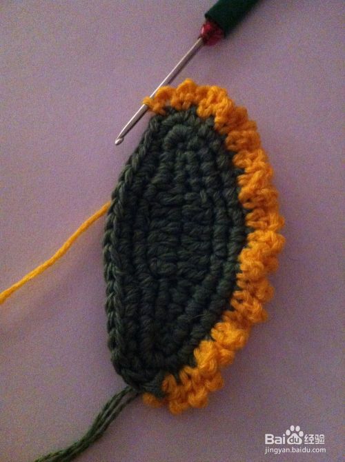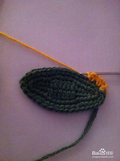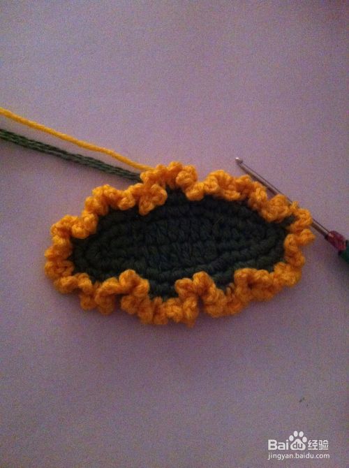 黄色线编织,钩针编织,在第一针针孔里面拉花5针,然后依然紧锁到这个针孔里面,拉花5针,再次紧锁到这个针孔里面,拉花5针,然后跳到下一个针孔里面紧锁,循环的钩法,完成1圈,钩出漂亮的蓝色花边边,收针断线。