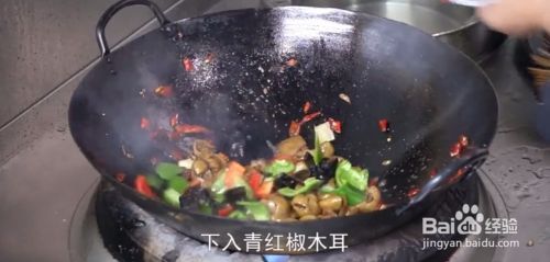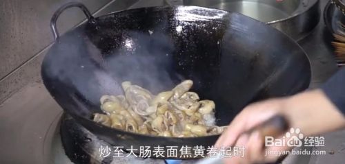 另起锅,加15克清油,放入大肠煸炒。炒至大肠表面焦黄卷起时,加5克酱油调色,加葱姜片,料酒5克。花椒10克,辣椒段15克,盐5克,鸡精5克,白胡椒粉5克。煸炒出辣椒和胡椒的香味,下入青红辣椒木耳。