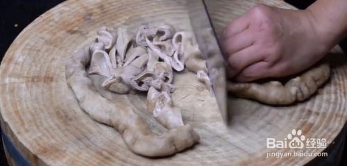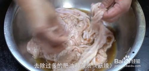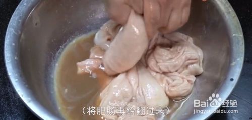 去除过多的油脂和杂质。将大肠在翻过来。再用清水清洗干净。