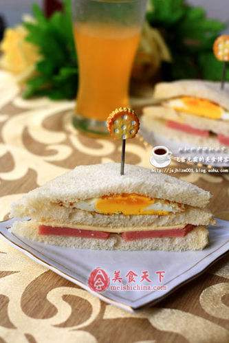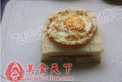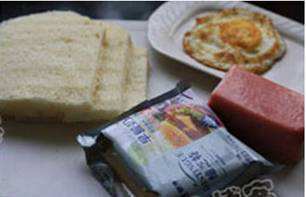 <p>土司三片、鸡蛋一个、火腿4小片、蒙牛缔芝特早餐奶酪一片。</p>