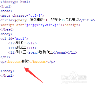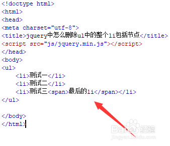 新建一个html文件,命名为test.html,用于讲解jquery中怎么删除ul中的整个li包括节点。
