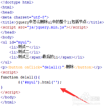 3、在js标签内,创建函数,在函数内,通过id获得ul对象,使用html()将ul对象内的所有元素置空,从而实现删除ul中的整个li包括节点。