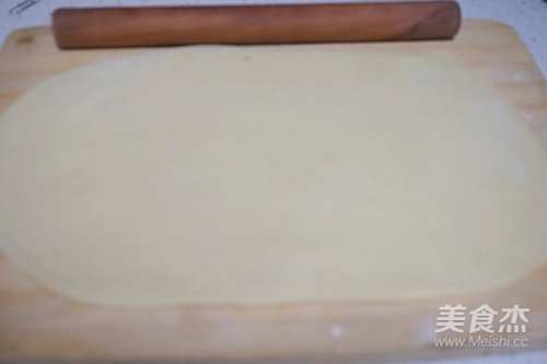 3接着把两个面团分别擀开,擀成长方形面片,腐乳面团放在上面。