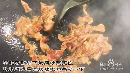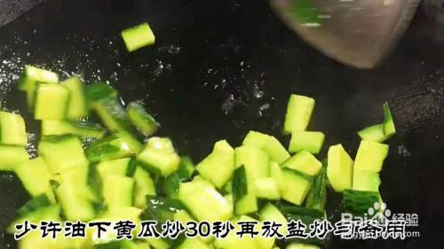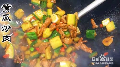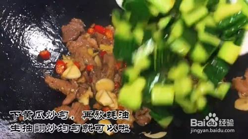 另起锅放入油下,瘦肉炒至变色再放入10克米酒爆香10克辣椒,10克蒜炒均匀。下入黄瓜炒再放入10克蚝油,10克生抽翻炒均匀即可