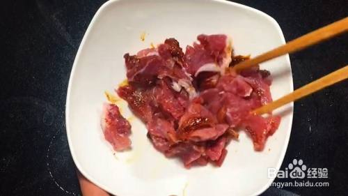 200克黄瓜切成小片,100克瘦肉放入10克酱油,10克胡椒粉,搅拌均匀。