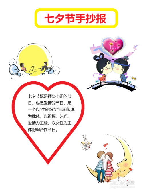 第七步,在文本框的上方,画牛郎织女相会和爱心的简笔画,用来突出主题。手抄报就完成了。