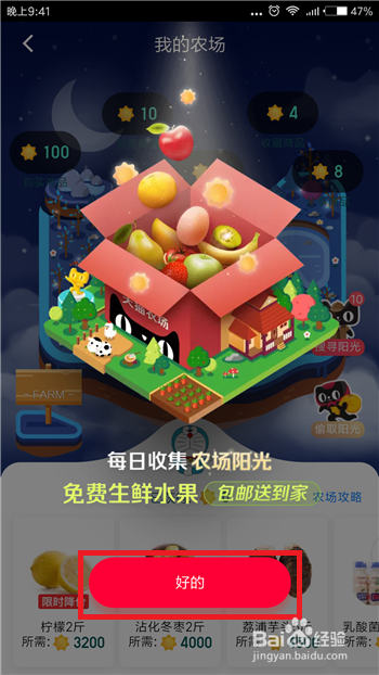 进入到活动后,系统会提示我们每日收集农场阳光,免费领取水果,点击【好的】开始进入农场。