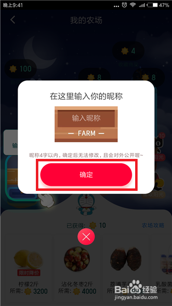 点击后会打开昵称界面,输入好我们的农场昵称后点击【确定】,这样就可以开启天猫农场了。
