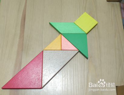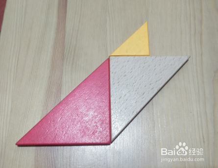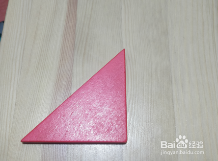 将粉色三角形直角水平居于左下,放在黄色三角形的右边挨着。
