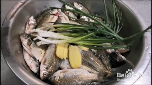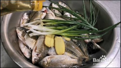 首先将小鲫鱼洗净,加盐,葱姜,料酒腌制半小时