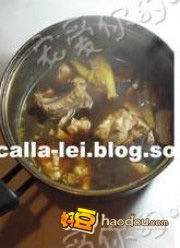 2小焖锅中放排骨、酱油、糖、盐、生姜、料酒、水(稍微多点)等煮。 大火煮开,换小火煮40分钟,直到排骨用筷子能轻松插透。