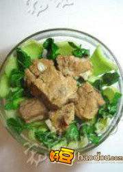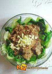 4把排骨铺在小白菜上,洒辣椒面、花椒面和蒜末。 辣椒面多的一碗是我的,蒜末多的一碗是他的。