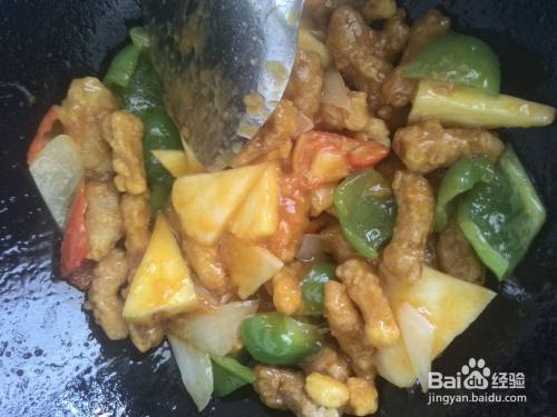 待糖醋汁浓稠,加入里罪悦脊条,蔬菜和菠萝,迅速翻炒均匀。
