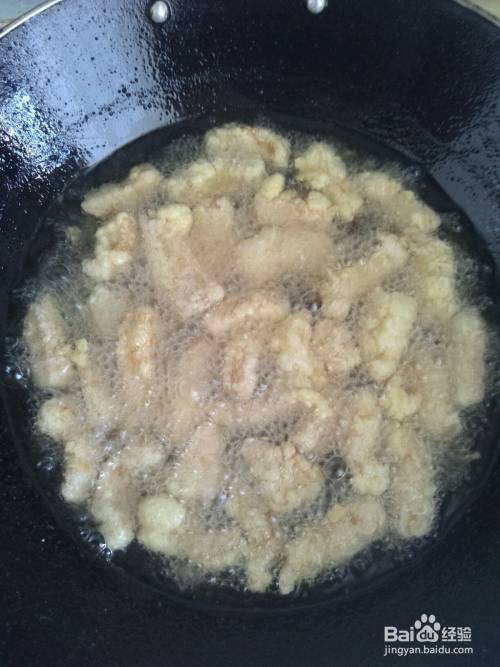 锅中倒入花生油,开大火加热。等油表面冒烟时,迅速放入裹淀粉的里脊条。
