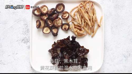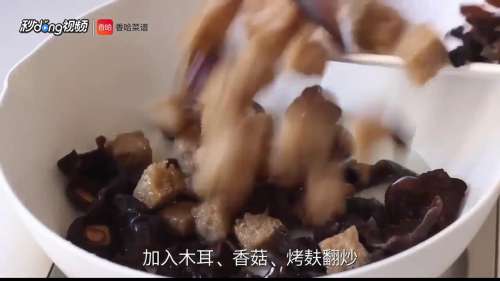 6热油下八角、桂皮爆香,下木耳、香菇、烤麸翻炒均匀。