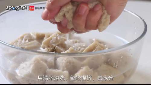 4烤麸切小块,焯水后凉水洗净,挤干水分。