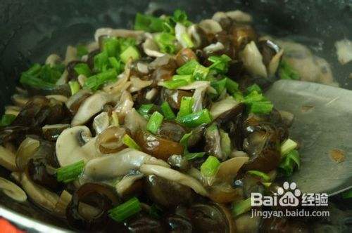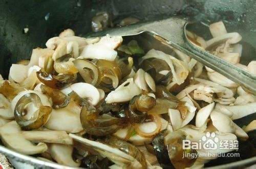 放入口蘑跟香菇,放适量盐,料酒一起翻炒均匀,并盖上锅盖闷2分钟