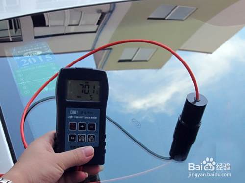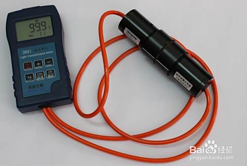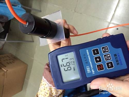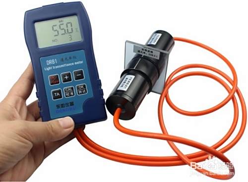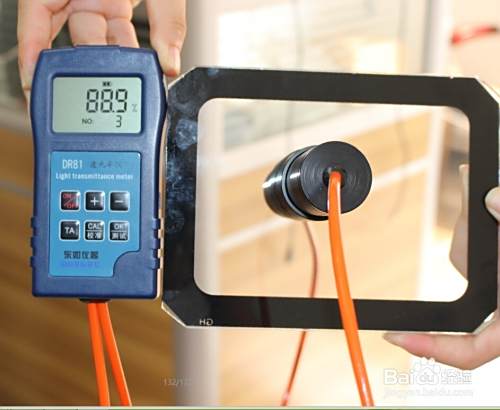 将探头分开,将干净的标准片(透光率55%)夹在探头上,并对好标准线,按下测试键进行测试