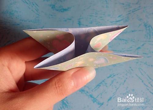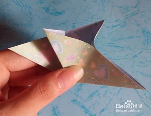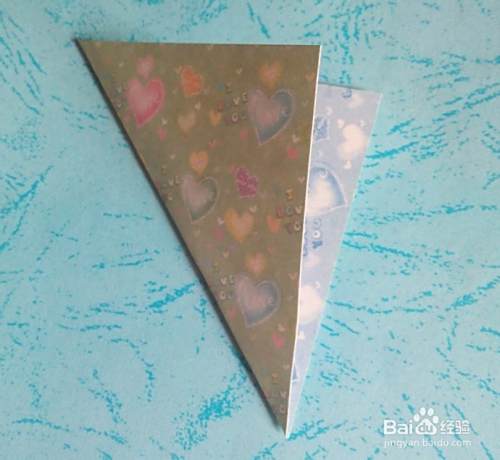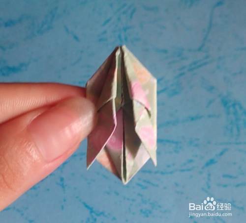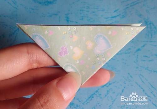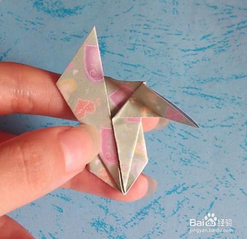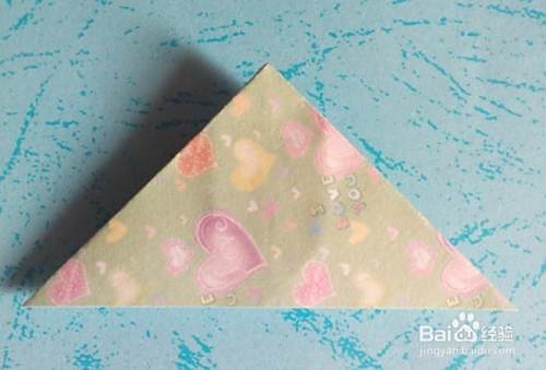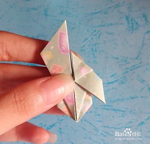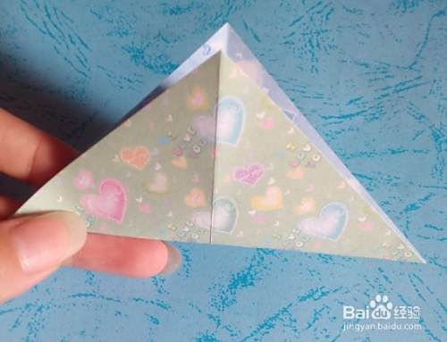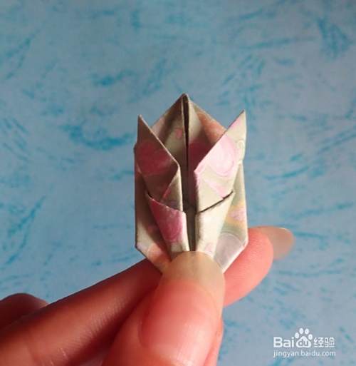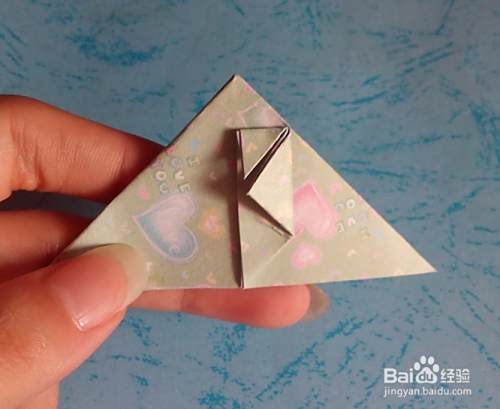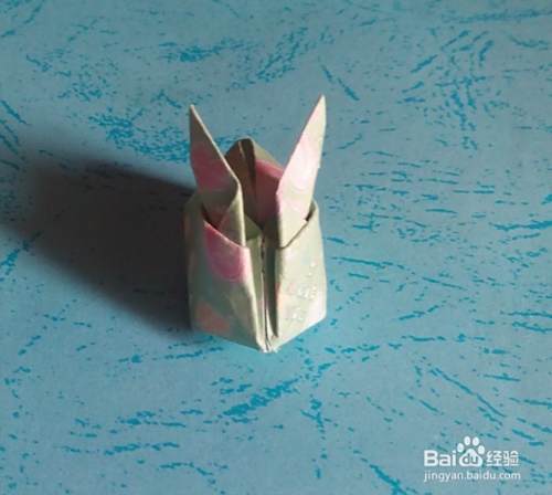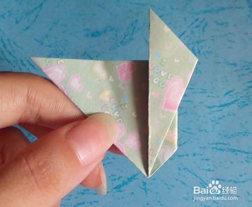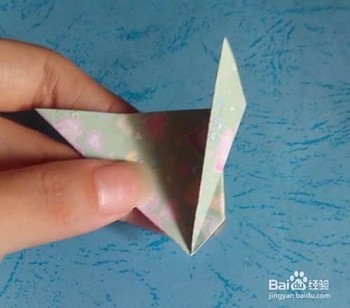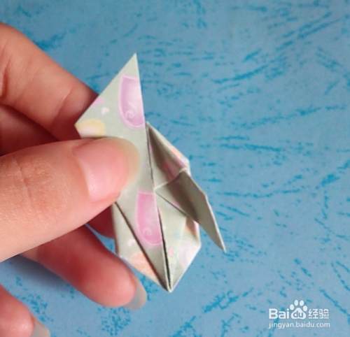 将叠好的兔子下半部分置于下边,翻过来的大三角形用来做兔子的头部及耳朵。将大三角形的两腰与中线重合