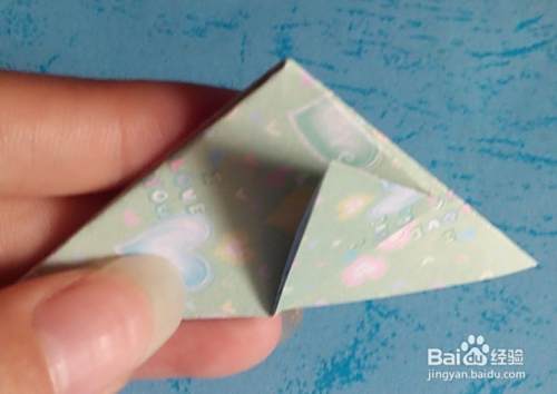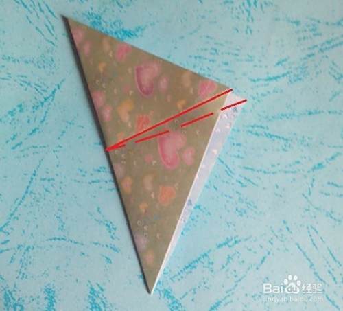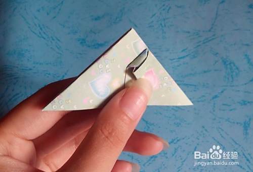 将右边多余的部分如图折出一个小直角三角形,直角部分与元大三角形的中线重合折叠,然后再对折一次,外面的边仍与中线重合。左边做相同的折叠。现在兔子的头部及耳朵就出现了。