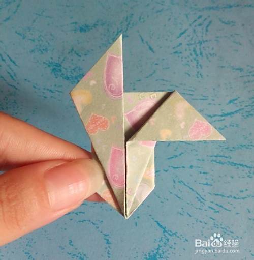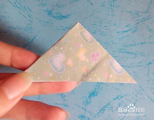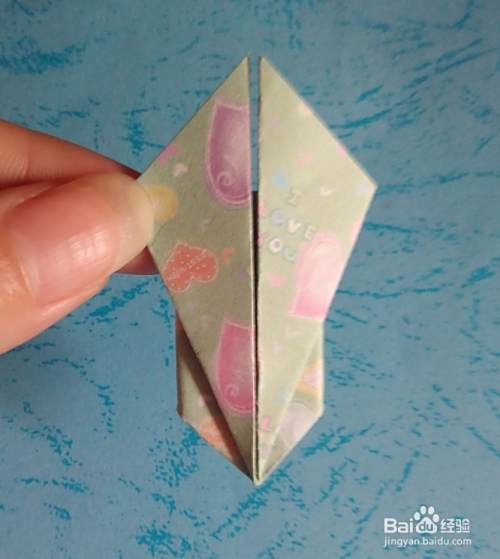 现在我们折叠兔子身体的下半部分。将三角形右边的角沿着中线折叠形成一个小直角三角形;将小直角三角形的直角折叠,直角的顶端与长边重合;将小直角三角形上边的小角对折;将对折后形成的三角形塞入直角的缝隙里;两边步骤一致,这样兔子的下半部分就完成了。
