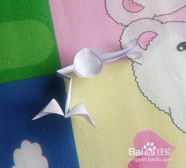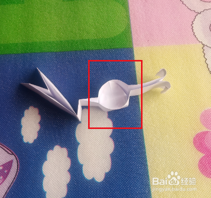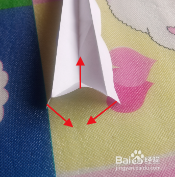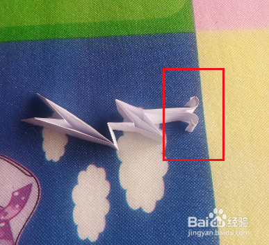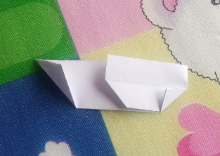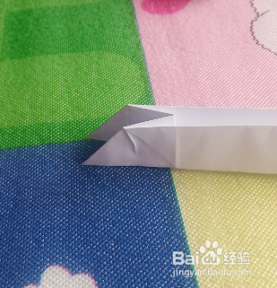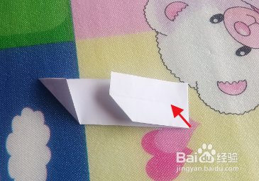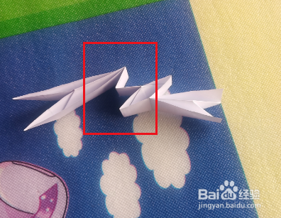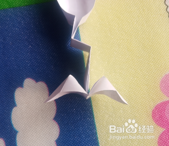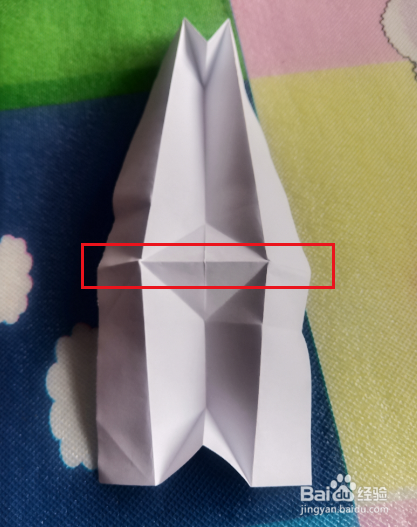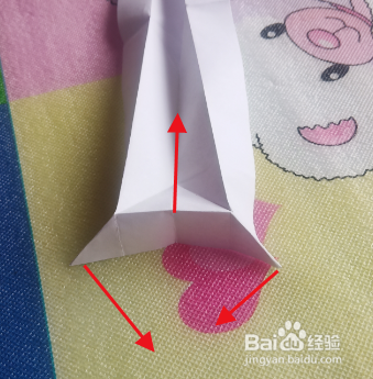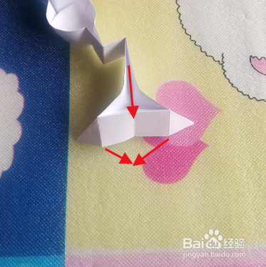 将大角一端的中间捏成凸起,再将两边角沿折痕向下折,最后将中间向上拉,两边向下折。