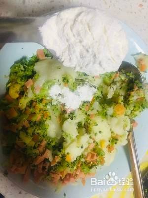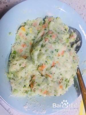 可以添加一点火腿,将所有切碎的蔬菜放到土豆泥里。
