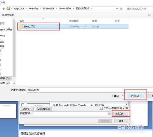 选择浏览,弹出我的幻灯片库,若没有文件夹,新建一个文件夹,然后单击选择,如图所示。