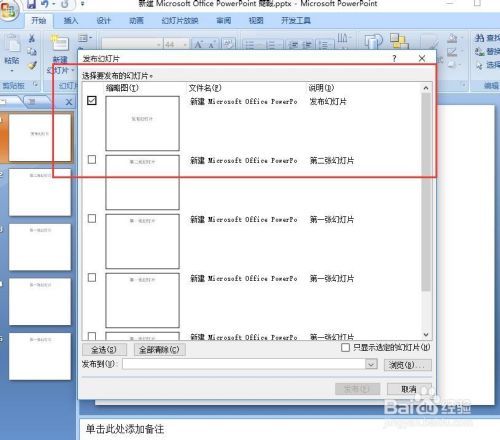 弹出发布幻灯片对话框,选择要发布的幻灯片,如图所示。