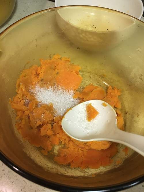 2红薯去皮切片蒸熟,用饭勺碾成泥。根据红薯的甜度及个人口味,加入少许白砂糖,一方面可以调味,另一方面也有助于酵母发酵。