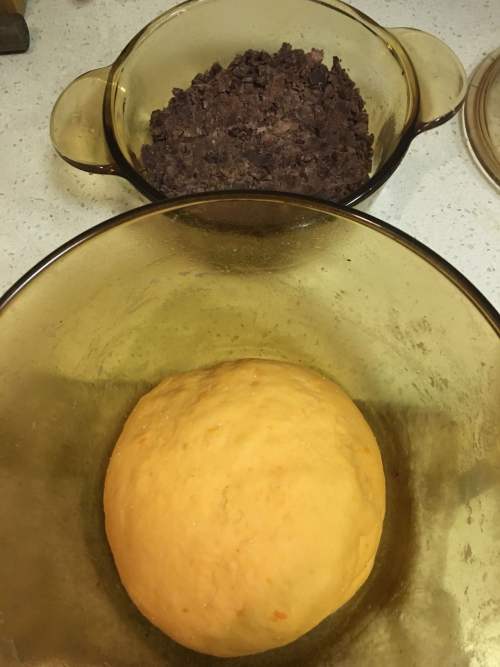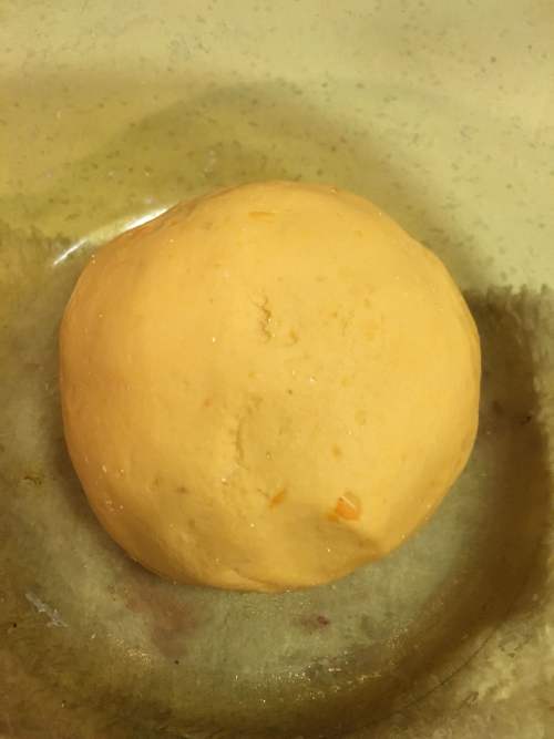 3待红薯泥温度和体温差不多,加入高筋面粉和酵母,揉至面团光滑,盖上盖子发酵。