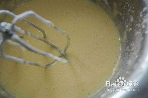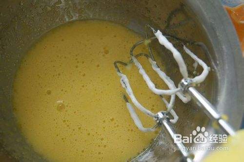 用电动打蛋器高速把蛋液打到是原来的2倍大,然后一点一点加入色拉油,打到颜色发白,是原来的3倍大,打的时候最好在底下放一盆温水,这样蛋液会打发的更好。