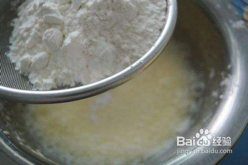 色拉油打到看不出油花了,筛入面粉跟泡打粉